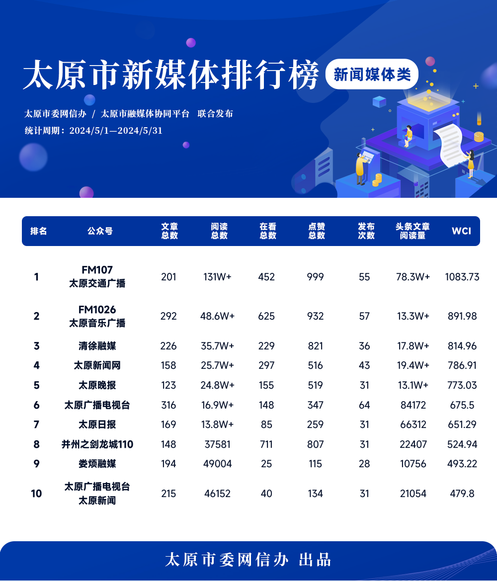 在本次發布的媒體微信榜單中,FM107太原交通廣播、FM1026太原音樂廣播、清徐融媒位列前三,太原新聞網、太原晚報分別位列TOP4、TOP5。