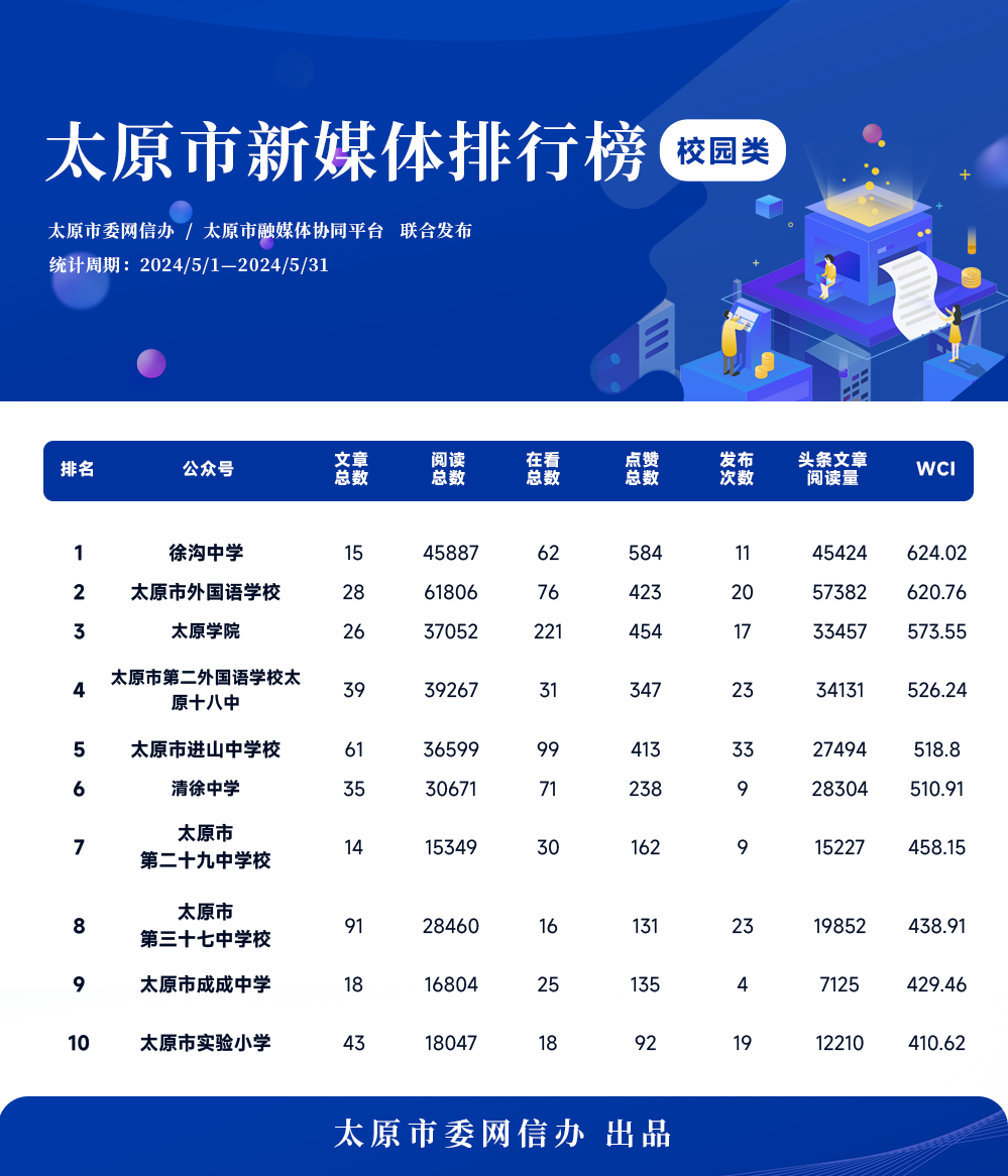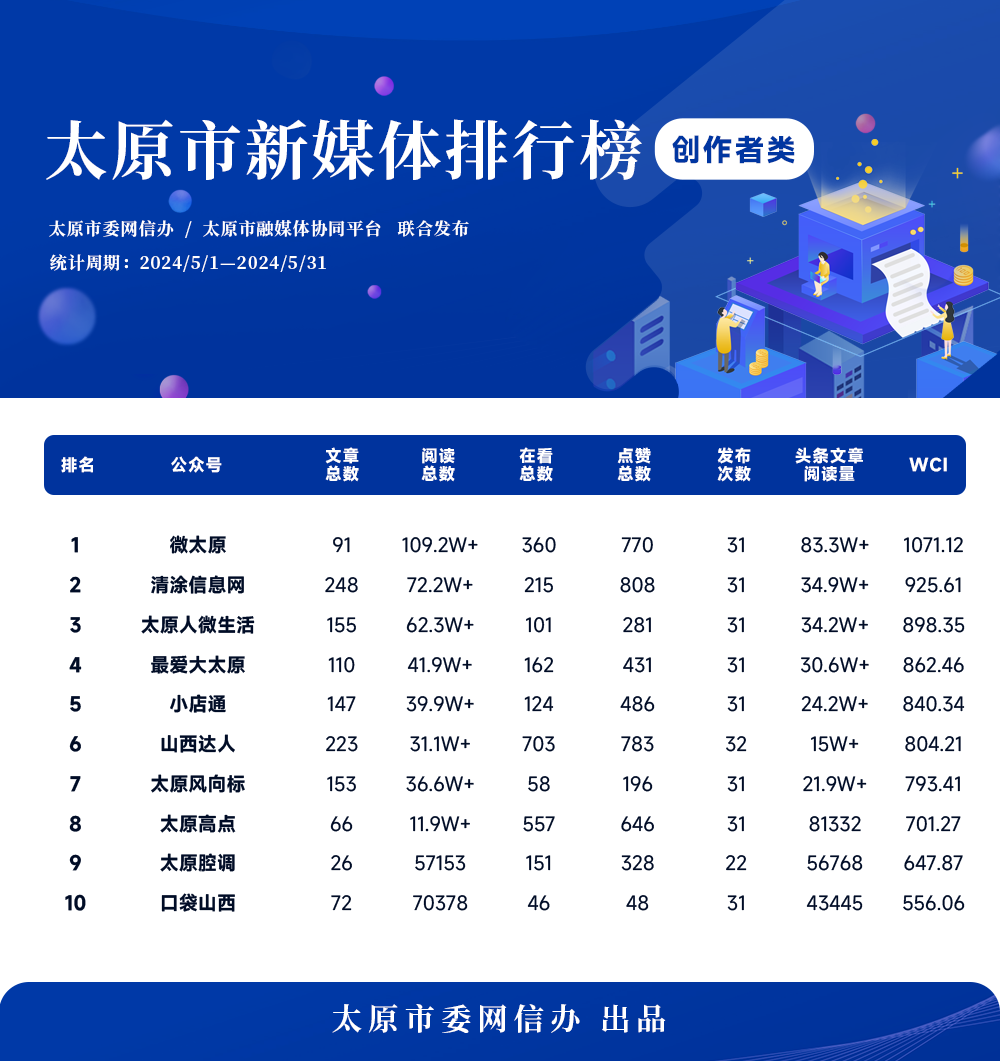 在本次發布的創作者微信榜單中,微太原穩居榜首,清涂信息網位列第二,太原人微生活位居第三,最愛大太原、小店通、山西達人、太原風向標、太原高點、太原腔調、口袋山西依次位列榜單前十。