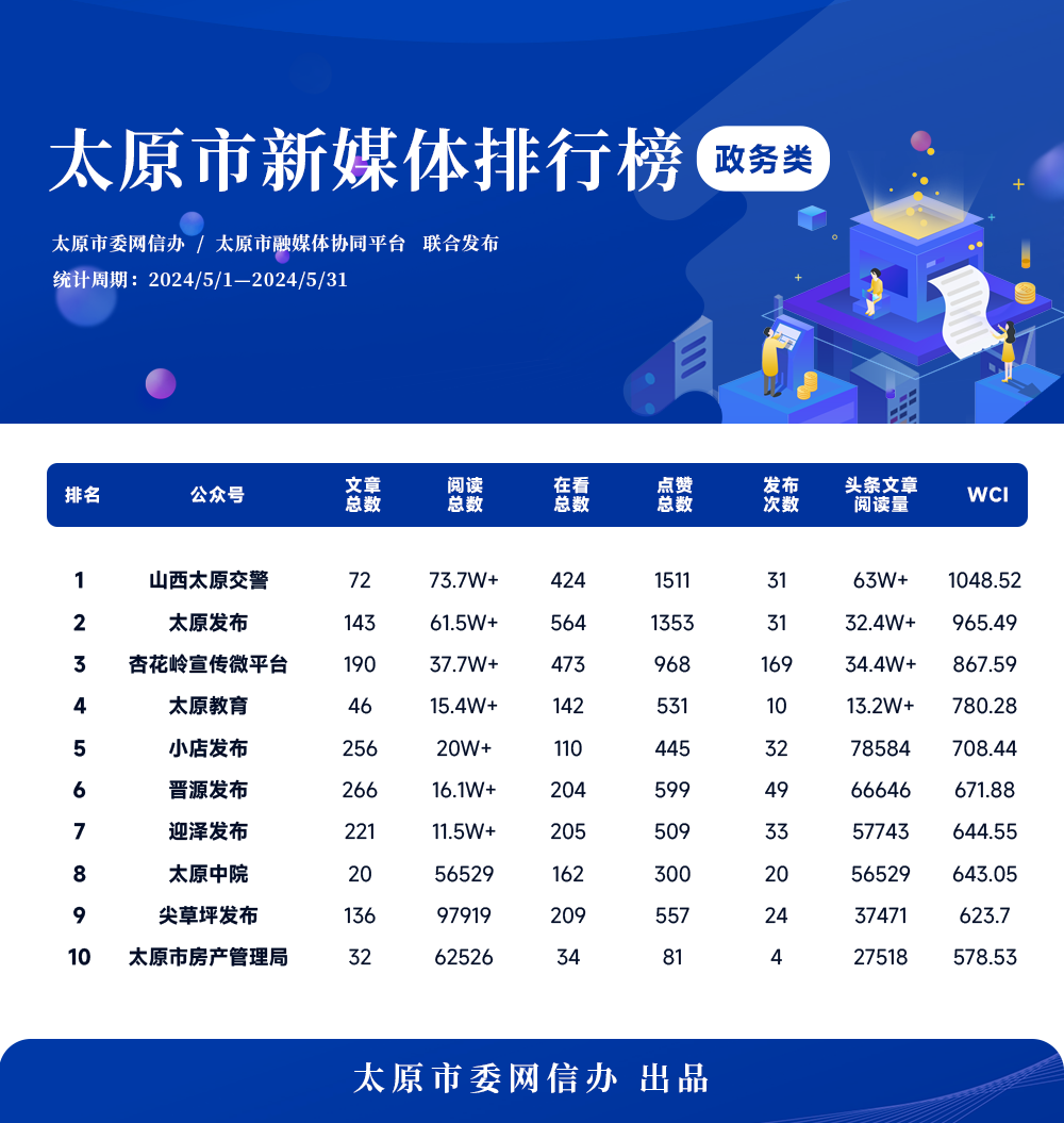 在本次發布的政務微信榜單中,山西太原交警位居TOP1,太原發布位居TOP2,杏花嶺宣傳微平臺位居TOP3,太原教育、小店發布、晉源發布、迎澤發布、太原中院、尖草坪發布、太原市房產管理局依次位列榜單前十。